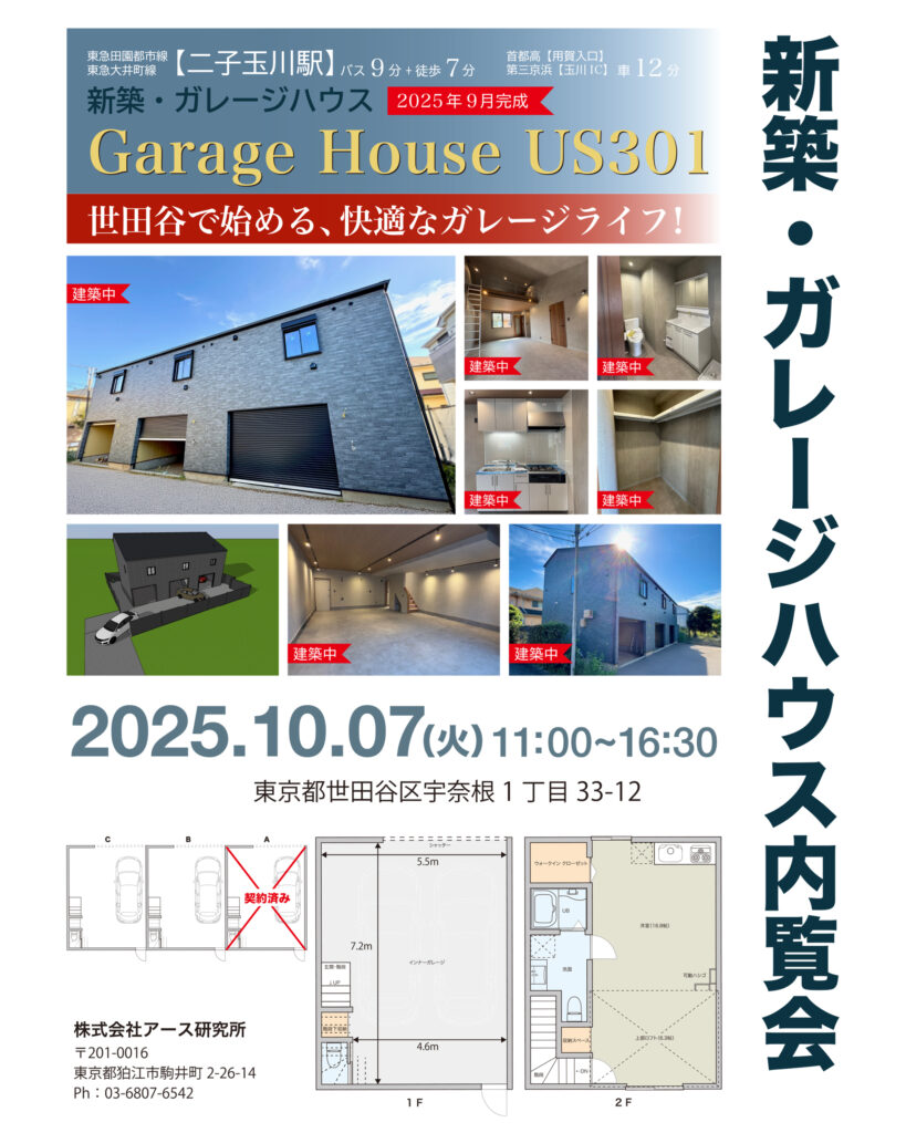 10/07(火) 11:00~16:30 世田谷区宇奈根の「GARAGE HOUSE US301」の内覧会を開催します。〒157-0068 東京都世田谷区宇奈根1丁目33-12。ガレージハウスに興味がある方向けに開催いたしますので、お時間ございましたら是非お越しください。よろしくお願いいたします🙇 コチラよりPDFダウンロード出来ます。